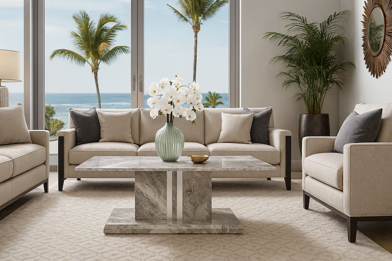The Amalfi Coffee Table brings sophisticated elegance to any living space with its striking marble paper finish top and coordinating wooden base. Polished stainless steel accents add a contemporary touch that catches the light beautifully, creating visual interest from every angle. This thoughtfully designed piece seamlessly blends modern refinement with timeless style, making it the perfect centerpiece for your home. Durable construction ensures lasting beauty, while the neutral grey tones complement virtually any décor scheme.