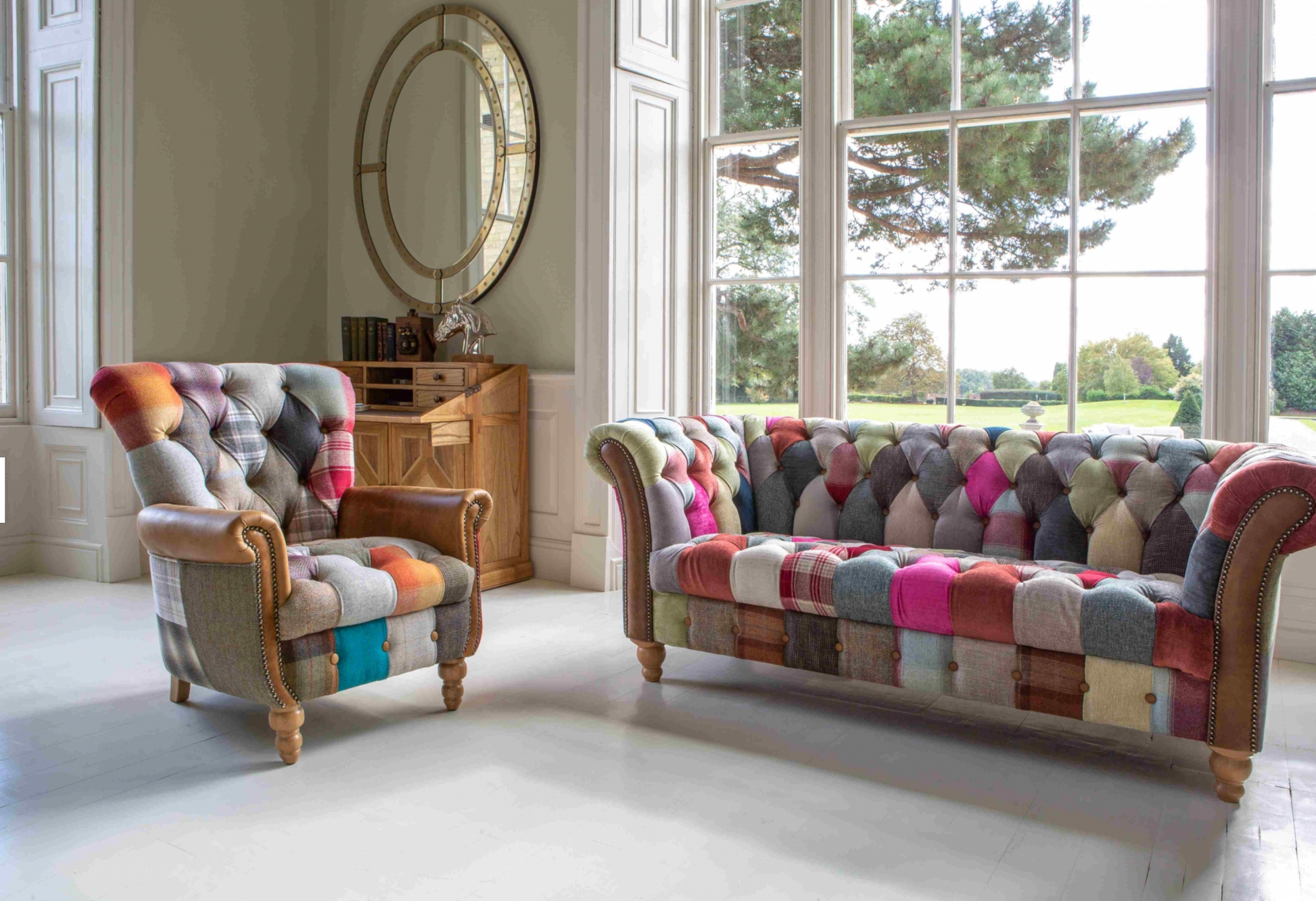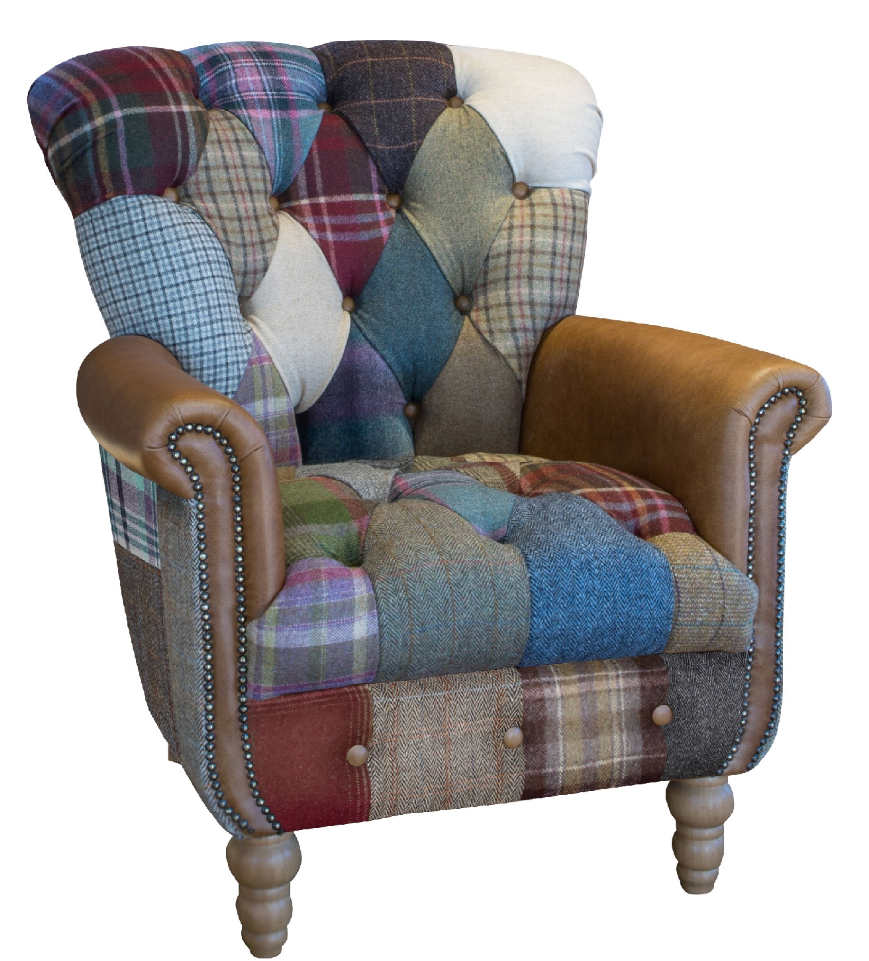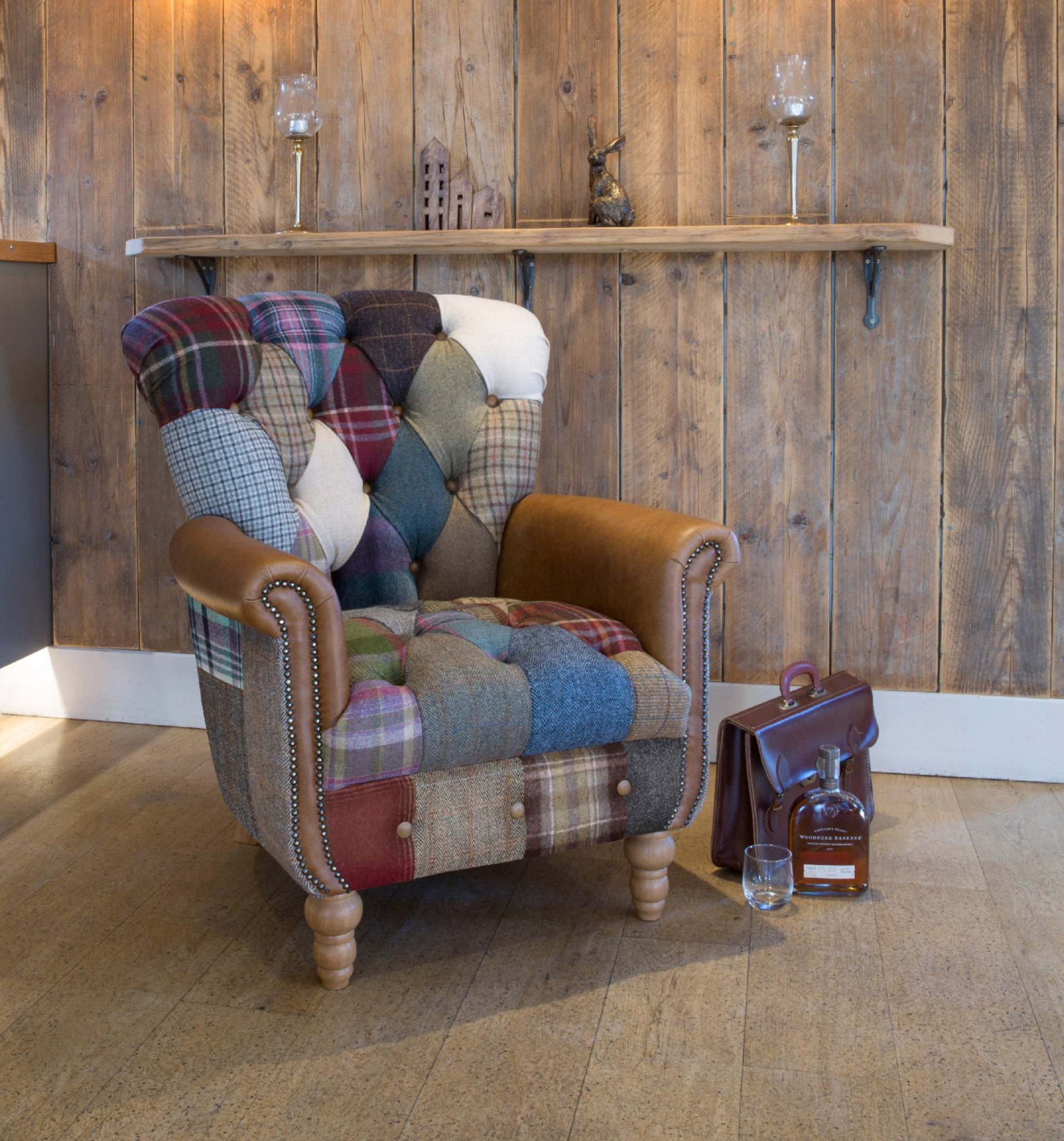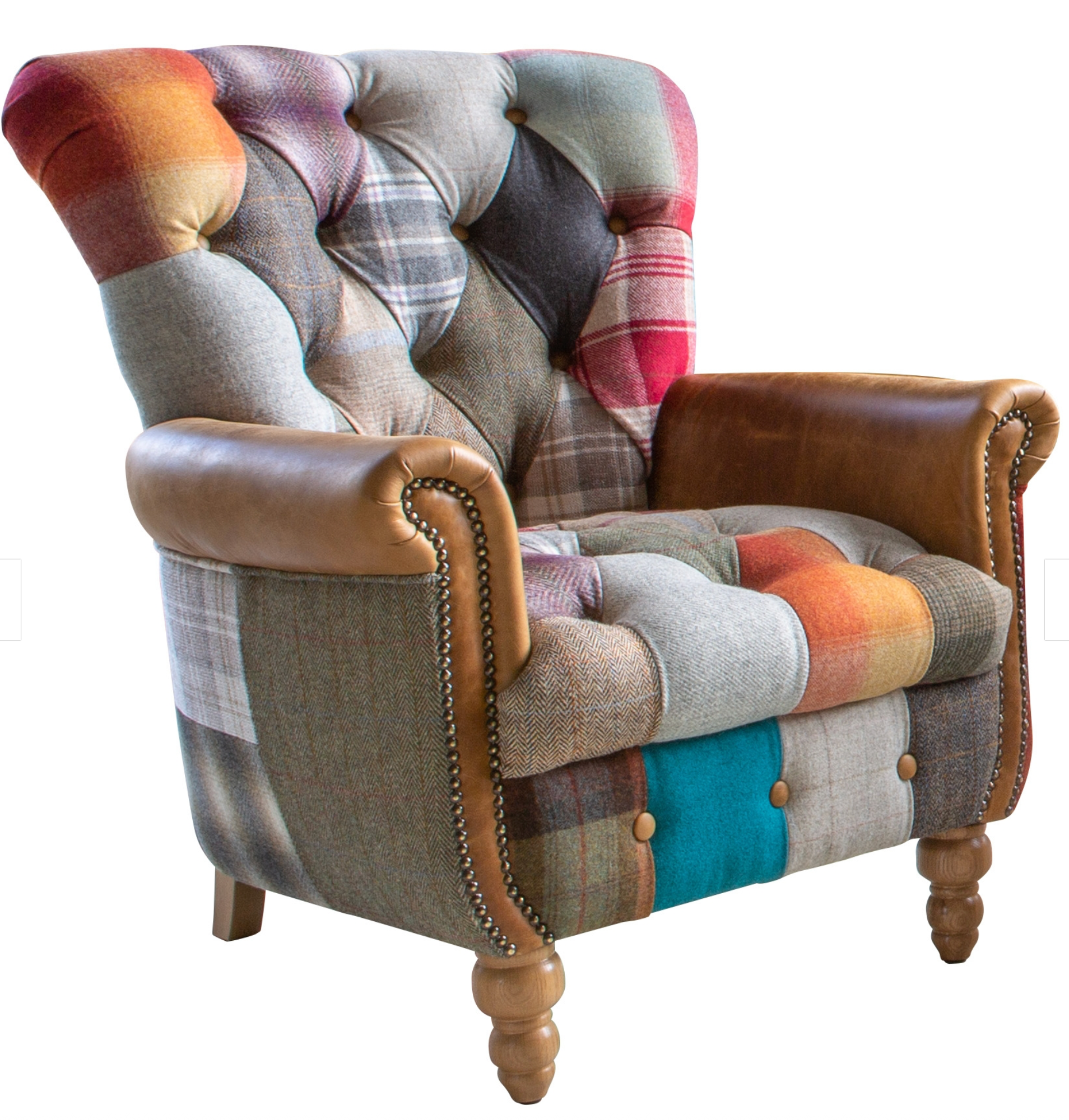The Gotham Harlequin Chair is a Fast Track model meaning that it is available and ready to go right now, although this means losing the element of personalisation you will still get a piece of furniture that will stand out and shine in any room with the amazing design and quality finish you'd expect from Vintage Sofa Company. This unit is made from leather, mixed wool & Harris Tweed and the specifications are as follows: Buttons - leather, Fixed Seat Cushion - mixed wool & Harris Tweed, Front panel - mixed wool & Harris Tweed, Hockey stick - leather, Inner arm - leather, Inside back - mixed wool and Harris Tweed, Outside - mixed wool & Harris Tweed, leather, Studs - baroc 02, Wood - 04 medium